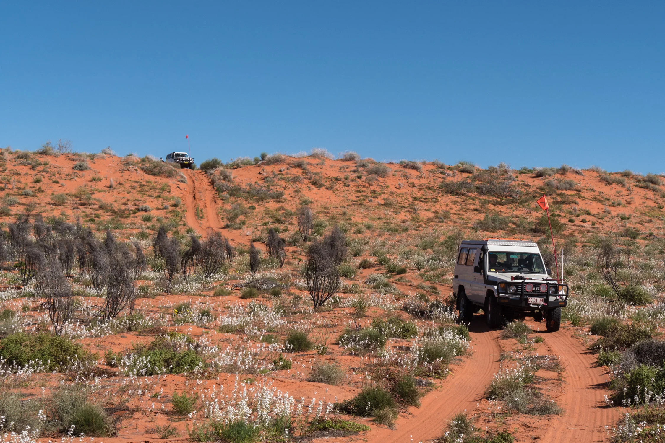 The next day we began the actual Madigan Line, picking it up on the far side of the Mac Clark Conservation Reserve. This was the beginning of the “red center,” the actual Simpson Desert—and we were surprised to find profusions of blooms and large areas of standing water. Six weeks earlier waves of storms pummelled the region and made most of the tracks impassable. We lucked out and for the rest of our 900 kilometer run across the Simpson we were treated to a garden show.
