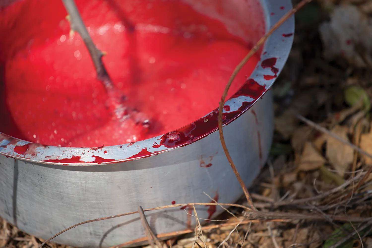 Images below: The blood was carefully collected for use in the shield-making. Blood is used to create the paint for ochre and black colors; milk is used to create the blue-gray and white colors. Two of the men took turns stirring the blood until it cooled, to keep it from coagulating.