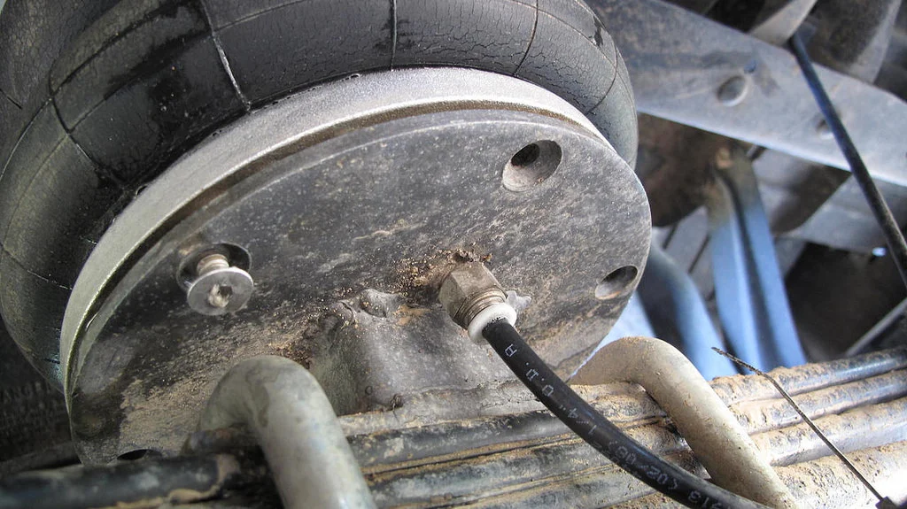Then, on a drive back from town, Roseann drove over a cross-axle ditch that flexed the suspension significantly, and when she hit a mild bump shortly after that the right rear spring bottomed with a thump. I looked under the truck and found the right bag completely deflated. Had it blown? We limped home, I filled the bag again with the truck parked, and . . . it held air just fine, displaying only the slow leak. The next day I drove the truck to test it, and after the first spot in the road where the suspension flexed, whump—the bag was dead flat again. Crikey.
