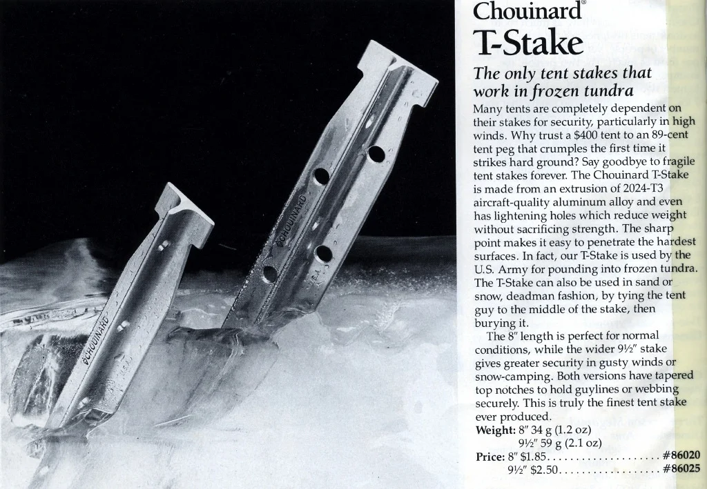 Thirty years ago, Black Diamond Equipment produced something they called the Chouinard T-Stake. It was made in two sizes, eight or nine and a half inches, from 2024 T3 heat-treated aluminum. We bought a dozen or so. If I’d known then what I know now, I’d have taken out a loan and bought a hundred. T-Stakes proved virtually indestructible, and the holding power was superb. My old Marmot Taku survived numerous howling Chubascos on Sea of Cortez islands anchored with just one upwind T-Stake; our North Face VE25 sat unperturbed through an arctic storm on the Beaufort Sea coast that the VHF radio said was gusting past 60 mph.