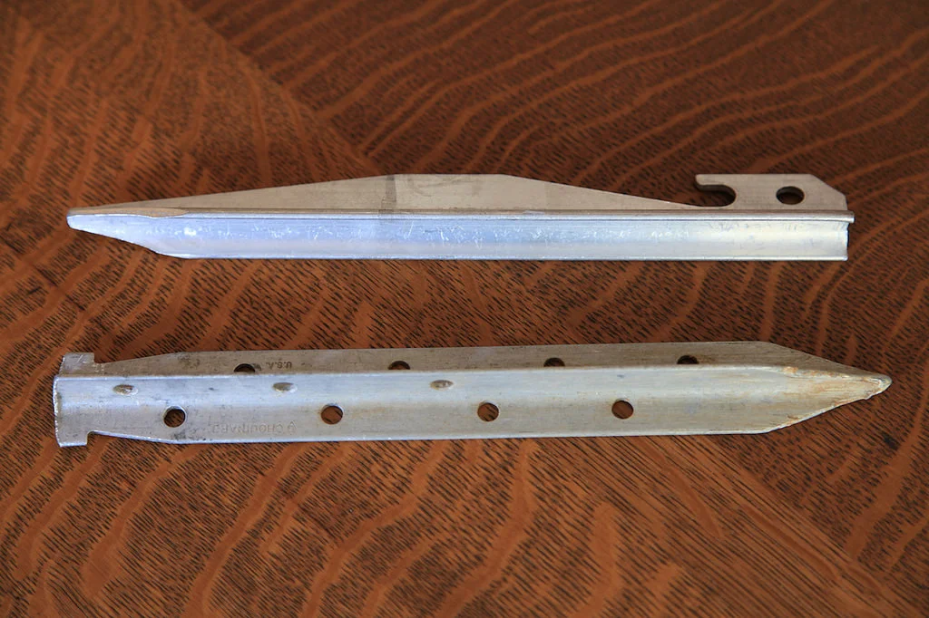 Ultimate stake on top, a well-used Chouinard T-Stake below