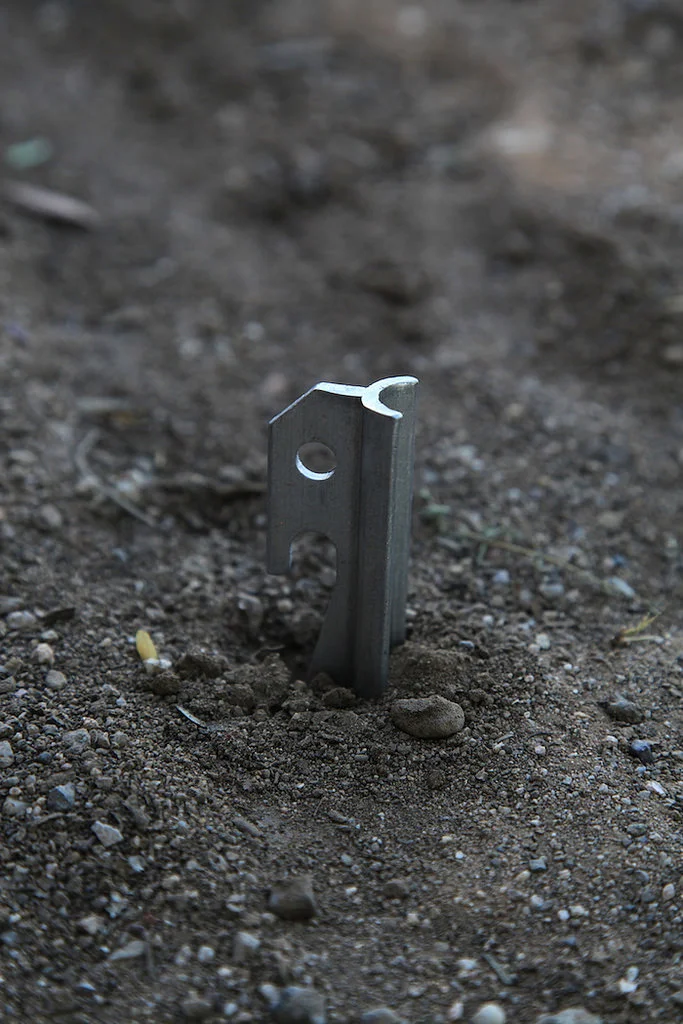 Made from 6061 T6 aluminum, and available in a stout nine-inch length and an even stouter twelve-inch, the Ultimate stake certainly looks the part. A central U-shaped body is backed up by a substantial gusset—no bending this one with my teeth. At the top are both a hook and a hole for tent loops or guylines (the hook also helps when pulling the stake out). Campmor says they’re made in the U.S., but I found not a trace of branding on the four nine-inch versions I ordered to try. I don’t know if Campmor has them made or is simply retailing them. That’s weird.