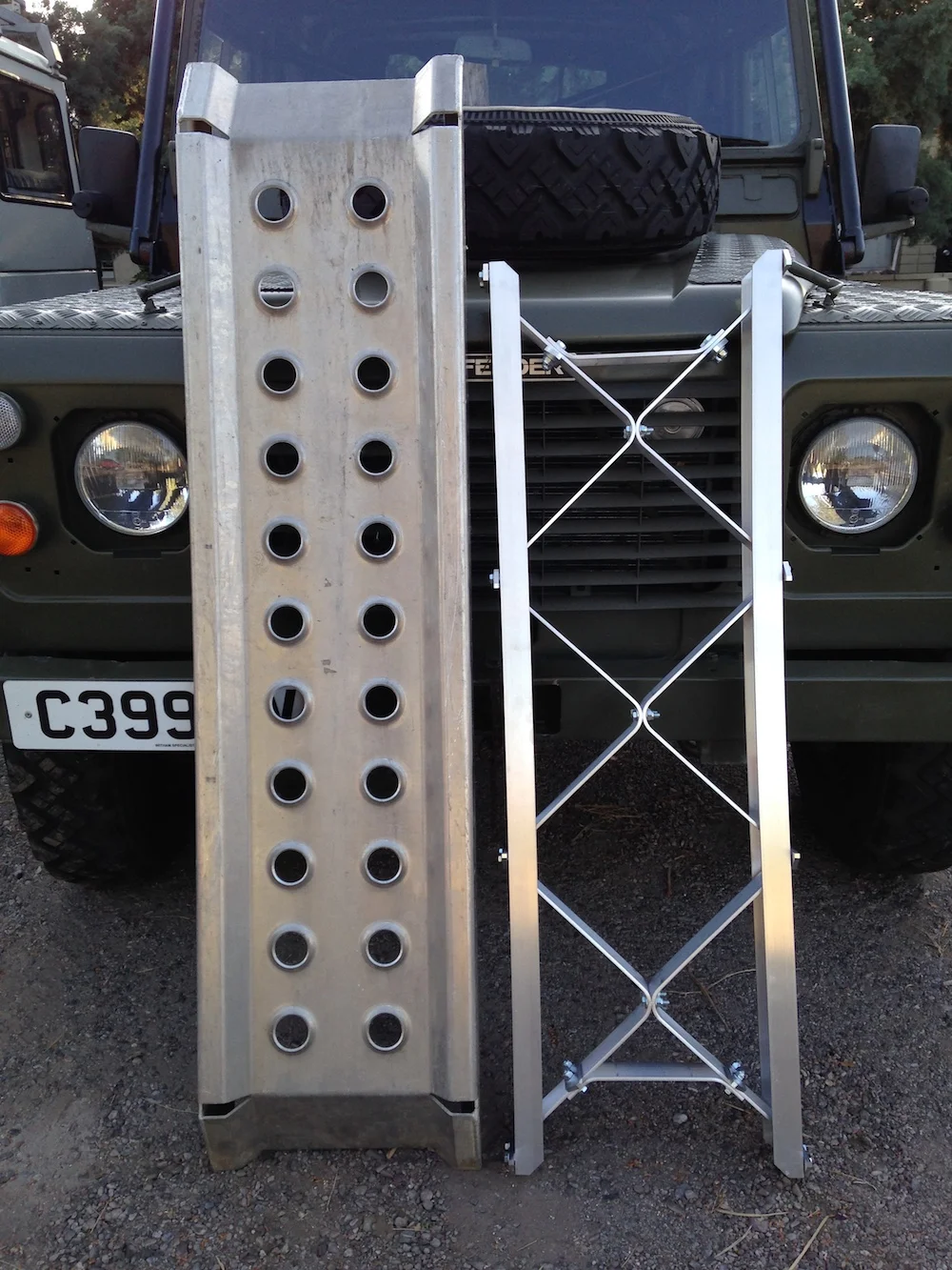 Semi-rigid material such as PSP and PAP works well to provide flotation and traction in soft substrates, but is not stiff enough to be used to bridge a deep ditch, or to function as a ramp to surmount a vertical ledge, unless doubled—in which case the normal complement of two allows only one wheel to be supported. Sahara explorer Tom Sheppard surmounted this problem decades ago by simply ordering a pair of custom-made ladder sections such as one would use at home, but with extra-deep side rails and rungs spaced just 15cm apart. Each section was sturdy enough to provide bridging support for one side of a loaded Land Rover—and with some connecting pieces also served as a convenient framework for kitchen furniture.