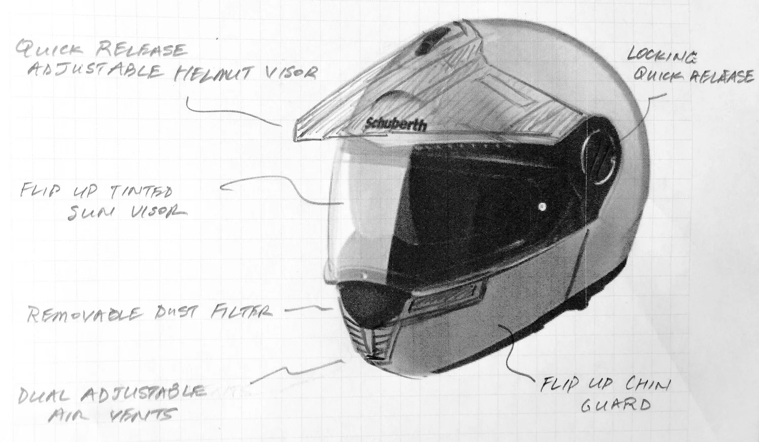 The new Schuberth E1 adventure helmet is based on their C3 modular design, with an adjustable peak visor and a filtered breather at the chin, as illustrated in the sketch above. Both the visor and the filter can be easily removed.