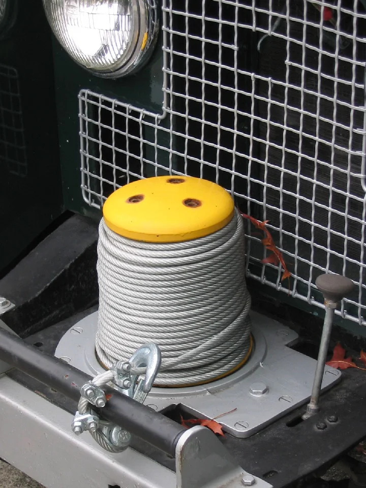 But the capstan on the Seattle Land Rover was—bewilderingly—wound with a long length of steel cable. This configuration cannot possibly function properly. You cannot use steel cable on a capstan as it is intended to be used—there would not be enough friction on the capstan and you would find the cable impossible to grip. And you cannot attach the free end of a steel cable to the capstan and expect it to wind in like a horizontal drum. It simply wouldn’t work and would likely destroy the winch in short order if it didn’t result in some much more serious failure. Note the horizontal bar on the mount, under which the rope is designed to run to properly feed it on to the capstan. Even if you managed to attach the steel cable and attempted to winch with it, it would instantly bunch up at the bottom of the capstan.