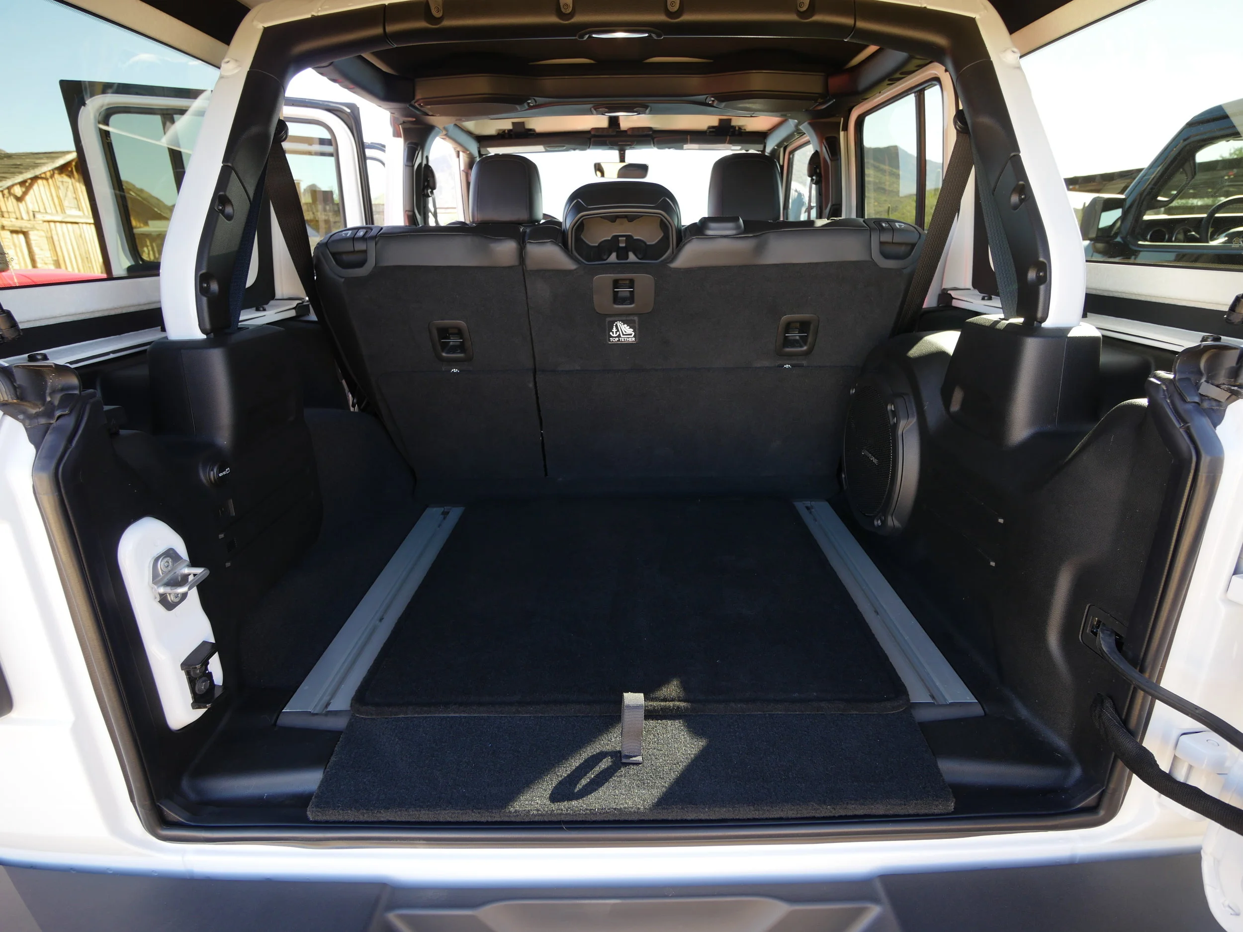 One of the Wrangler's glaring disadvantages in comparison with other iconic expedition vehicles has been cargo volume and GVWR. Looking at the rear of the new one, the space appeared no larger but seemed more square, which is an improvement. Thankfully the goofy floor-mounted speaker is gone, although its vertically oriented replacement is larger in diameter and still intrudes on precious cargo space. A welcome addition is the brace of tie-down tracks to secure gear; however, they are inset so far toward the center of the space—and that minimal space will be so packed with stuff—that usability when loaded for a long trip will be questionable. For a traveling couple who can lower the back seat (which folds flat), the cargo situation improves significantly as volume goes from 31 to 70 cubic feet, but for a family of four it's going to be tight.