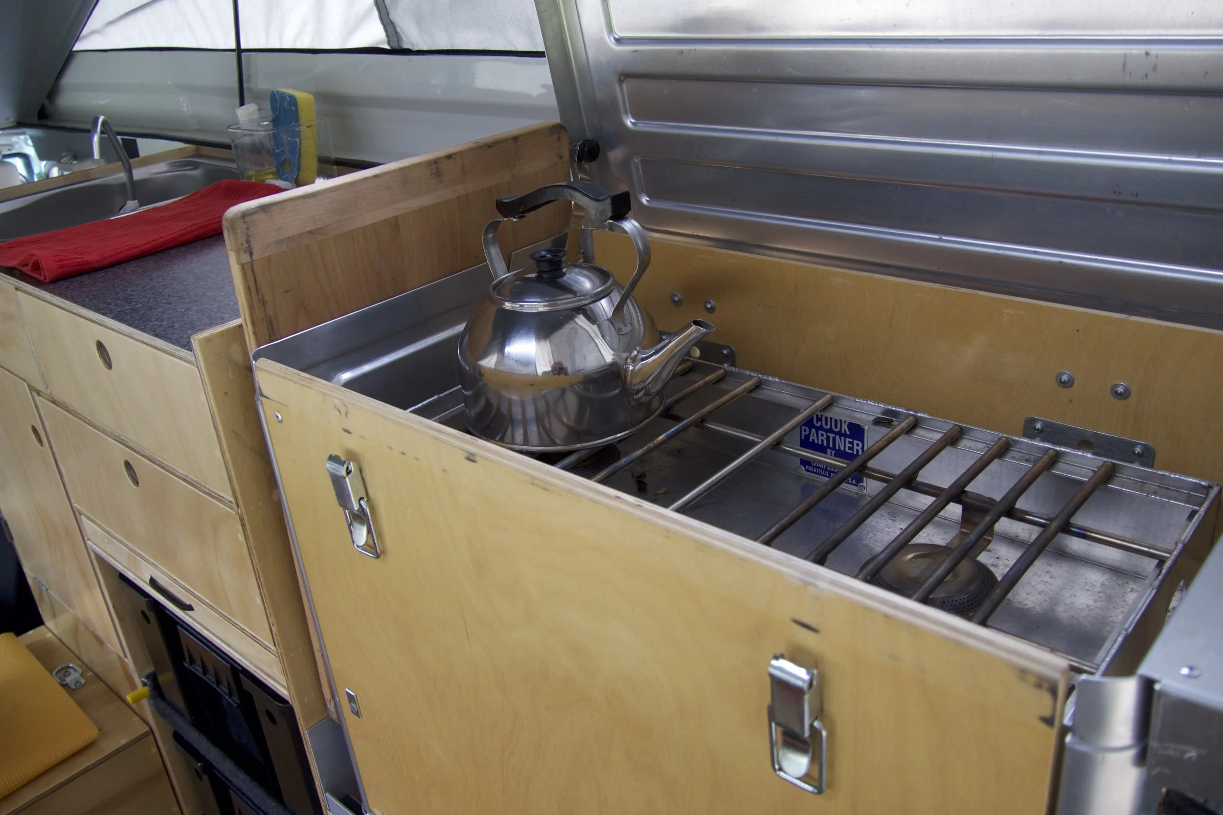 All this planning was done with measurements, drawings, and instinct, and organized from 6,000 miles away, so we had some apprehension until we saw the finished product installed. And one night’s use was enough to lay all doubts to rest. Cozy? Yes—but both of us could sit inside while one cooked if it was frightful outside and we wanted to be buttoned up. Storage space was simply massive—we were stunned at how much of our gear disappeared inside the side and front bench and cabinets. Total time to pitch camp, including raising the roof, deploying and staking down the awning, setting out the folding table that stores cunningly in a slot in the bench, and setting out our Kermit chairs, was under 10 minutes.