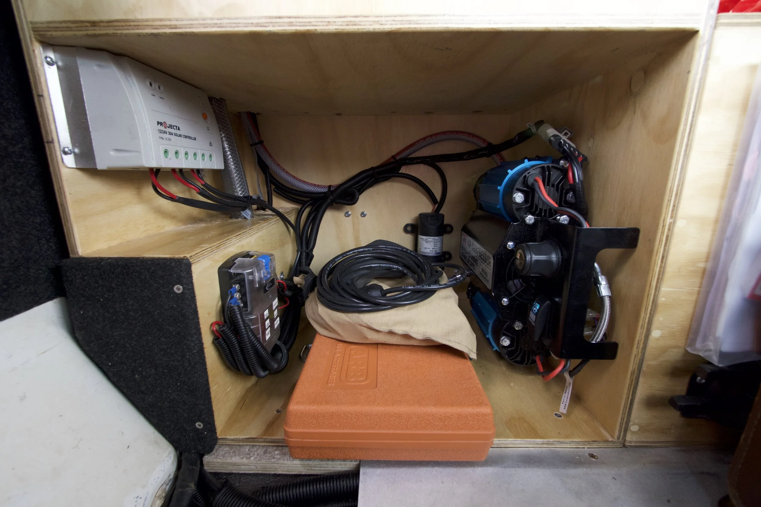 Systems management is dealt with in two locations. In the face of the cabinet under the sink are a level gauge for the water tank and a power meter for the batteries (as well as the rocker switch for the faucet, which is on-or-off and could be improved with a variable-pressure control). And behind the driver’s seat is a recessed compartment containing the charge controller for the solar panel, a fuse panel, the easily replaceable water pump, and the hard-mounted ARB Twin compressor. There is room left over for the air hose and chuck for the compressor, and a tire repair kit.