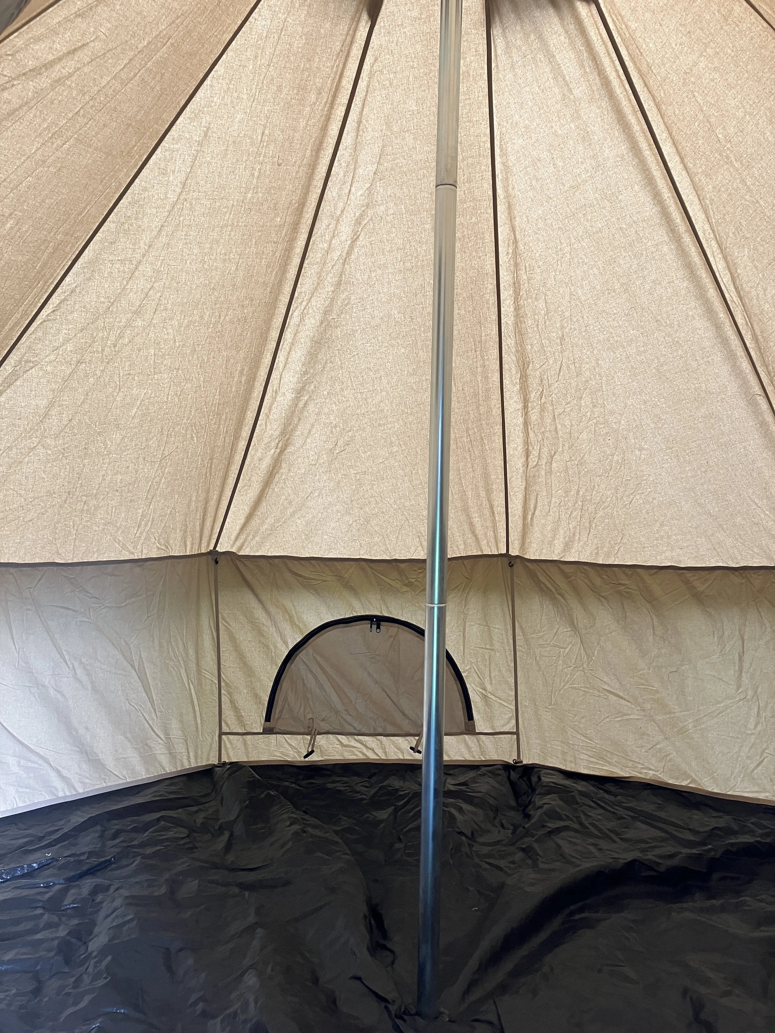 The center pole of the Regatta is a massive 1.5 inches in diameter—neither you nor the weather gods will bend this thing. It incorporates a steel loop near the top for hanging a lantern. The single door pole is an inch in diameter. I was overjoyed to see the tent’s outside perimeter stakes were J-shaped rebar—heavy but indestructible. The floor perimeter stakes, which aren’t under significant tension, were lighter round steel pegs which I nevertheless replaced with hardware-store 8-inch nails. The kit even includes a soft-faced no-bounce mallet. (I replaced this too, with a two-pound sledge, partially because the nail heads would have destroyed the face of the included hammer.)