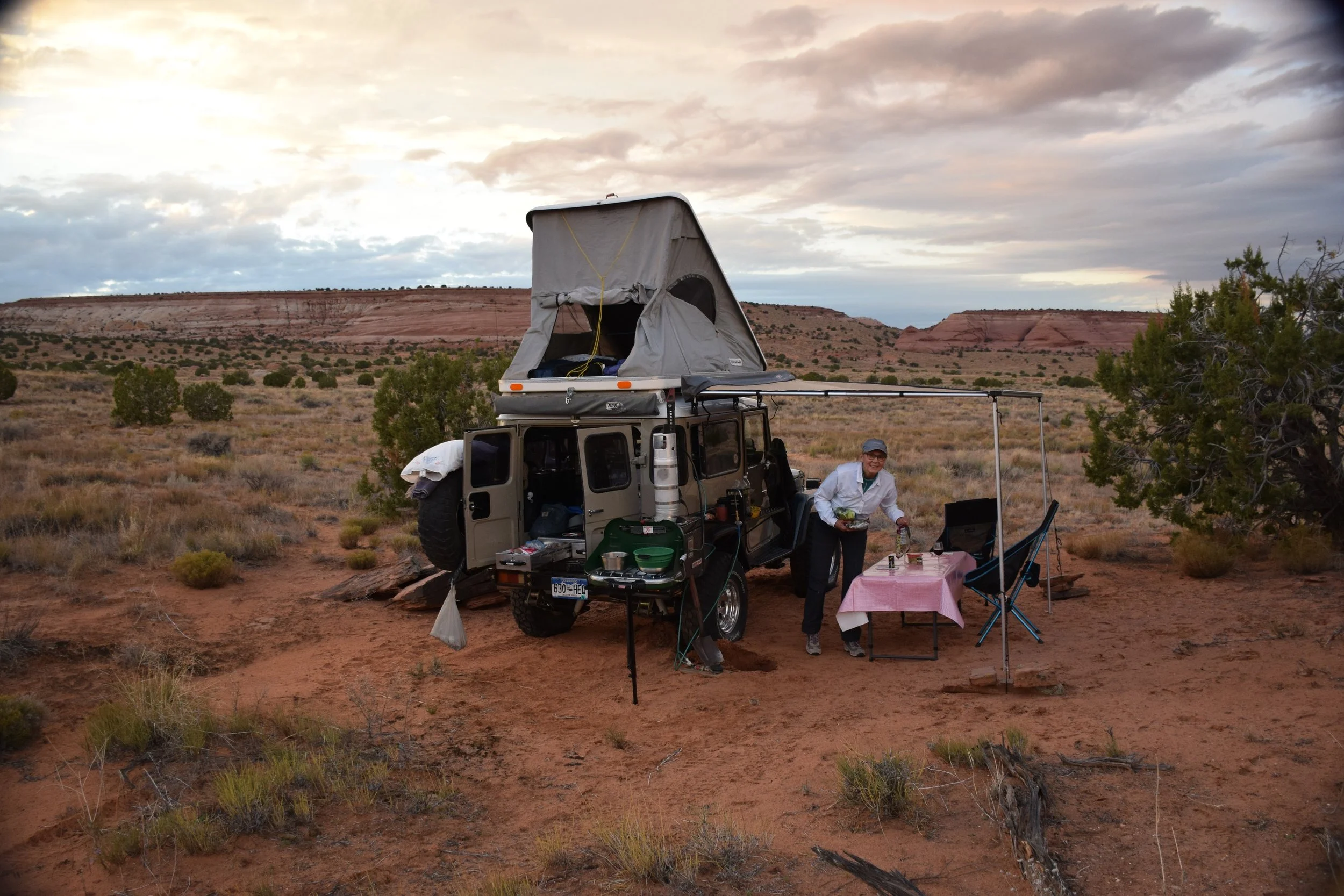 Steve reports up to 23 mpg at 60 mph (@2,000 rpm), which, given the roof tent, dual 12-gallon water tanks, and auxiliary fuel tank on the vehicle (not to mention the drag coefficient of the FJ40, roughly equivalent to that of a three-bedroom house), is pretty impressive.